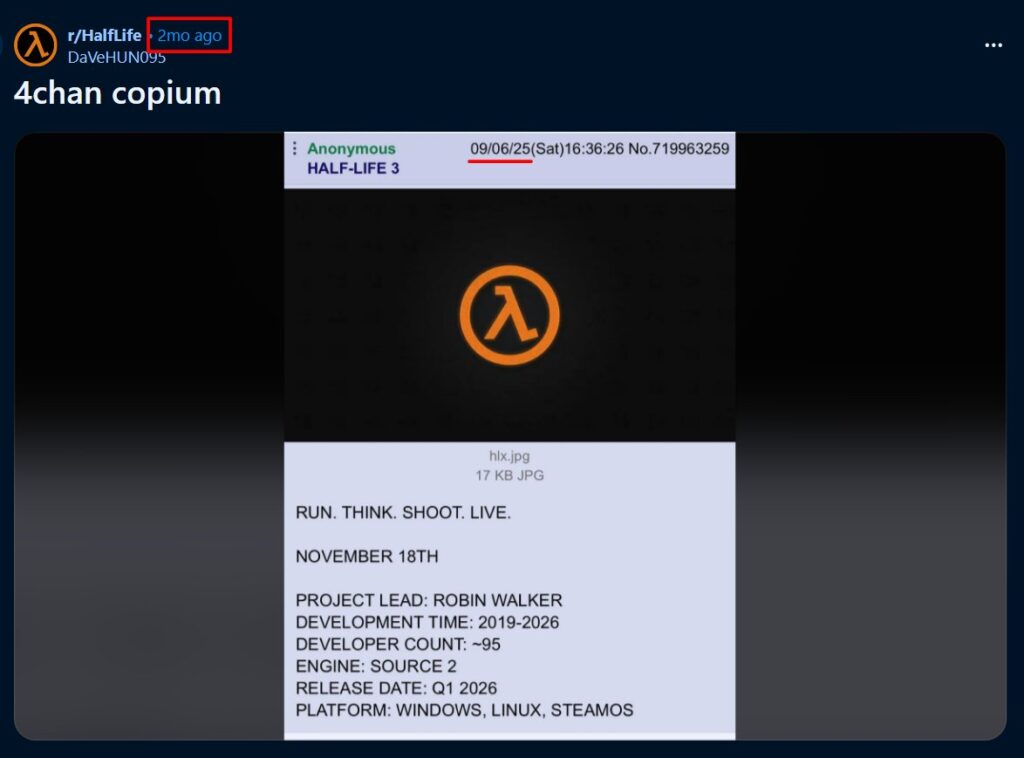 طبق این پست، Half-Life 3 طی شش سال، از ۲۰۱۹ تا ۲۰۲۶، با تیمی حدود ۹۵ نفره توسعه یافته و هدایت آن به رابین واکر نسبت داده شده است؛ کسی که در ساخت تمام عناوین اصلی Valve نقش داشته. در این ادعا، عرضه بازی برای سه‌ماهه اول ۲۰۲۶ و پلتفرم‌های هدف شامل ویندوز، لینوکس و SteamOs ذکر شده است.