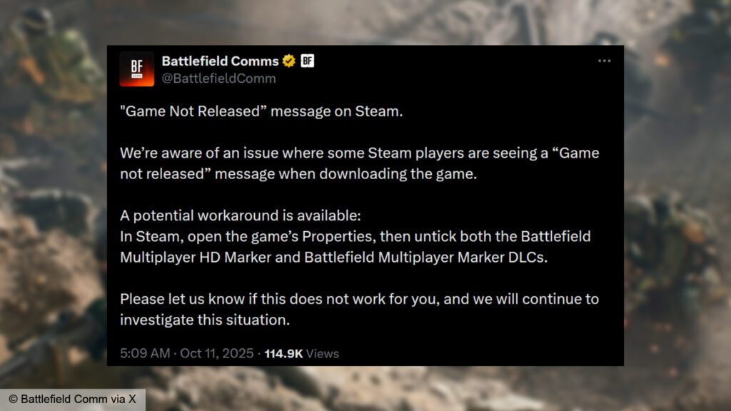 تیم توسعه همچنین اعلام کرده که از هشدار «بازی منتشر نشده» در نسخه استیم Battlefield 6 که هنگام دانلود بازی برای برخی کاربران نمایش داده میشود، آگاه است. بهعنوان راهحل احتمالی، پیشنهاد شده است که کاربران از طریق کتابخانه استیم وارد منوی Properties شده و تیک گزینههای ‘Battlefield 6 multiplayer HD marker’ و ‘Battlefield multiplayer marker’ را بردارند.