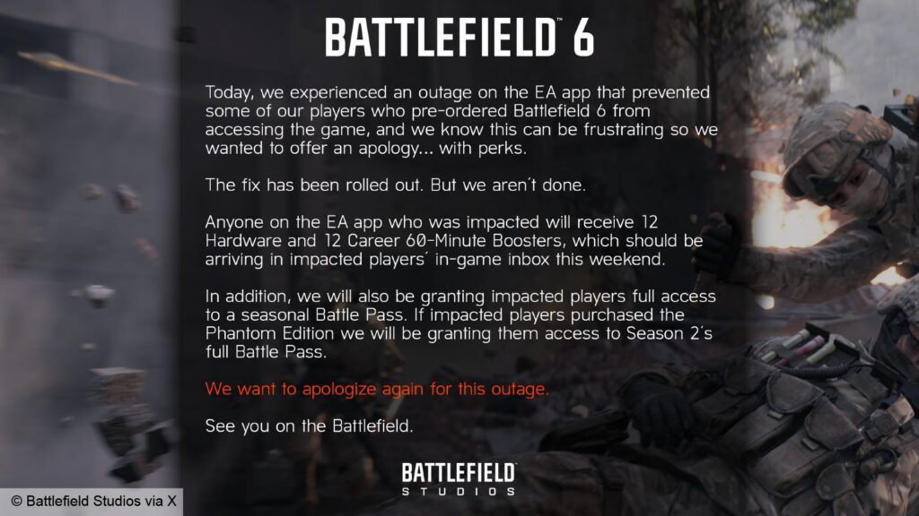 برای بازیکنانی که با اختلال مواجه شدند، استودیو Battlefield دو هدیه در نظر گرفته است: ۱۲ عدد Hardware Booster و ۱۲ عدد Career Booster که از طریق صندوق پیام داخل بازی در آخر هفته ارسال خواهد شد. این آیتمها به بازیکنان کمک میکند تا سریعتر ارتقا پیدا کرده و به بهترین سلاحها و تجهیزات Battlefield 6 دست یابند. علاوه بر این، بازیکنان آسیبدیده «دسترسی کامل به یک بتلپس فصلی» دریافت خواهند کرد. کسانی که نسخه Phantom Edition را خریداری کردهاند که شامل بتلپس فعلی است، بهجای آن بتلپس فصل دوم را دریافت خواهند کرد.