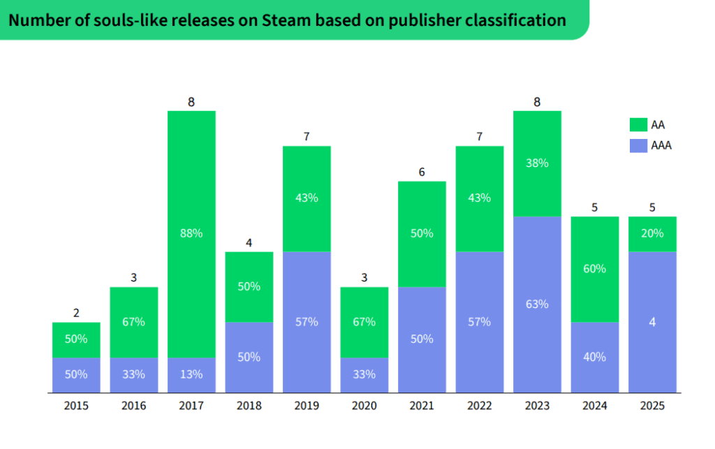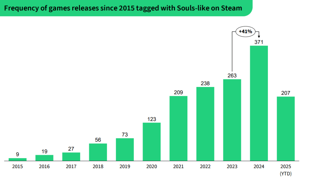 بر اساس مطالعه جدیدی از شرکت تحلیل داده VG Insights، تعداد بازیهایی که در پلتفرم استیم با برچسب «Similar to Dark Souls» منتشر میشوند، طی ده سال گذشته رشد خیرهکنندهای داشته است. این بررسی تمامی بازیهایی را شامل میشود که از ژانویه ۲۰۱۵ تا اکتبر ۲۰۲۵ (دی ۱۳۹۳ تا مهر ۱۴۰۴) در استیم با این برچسب عرضه شدهاند.