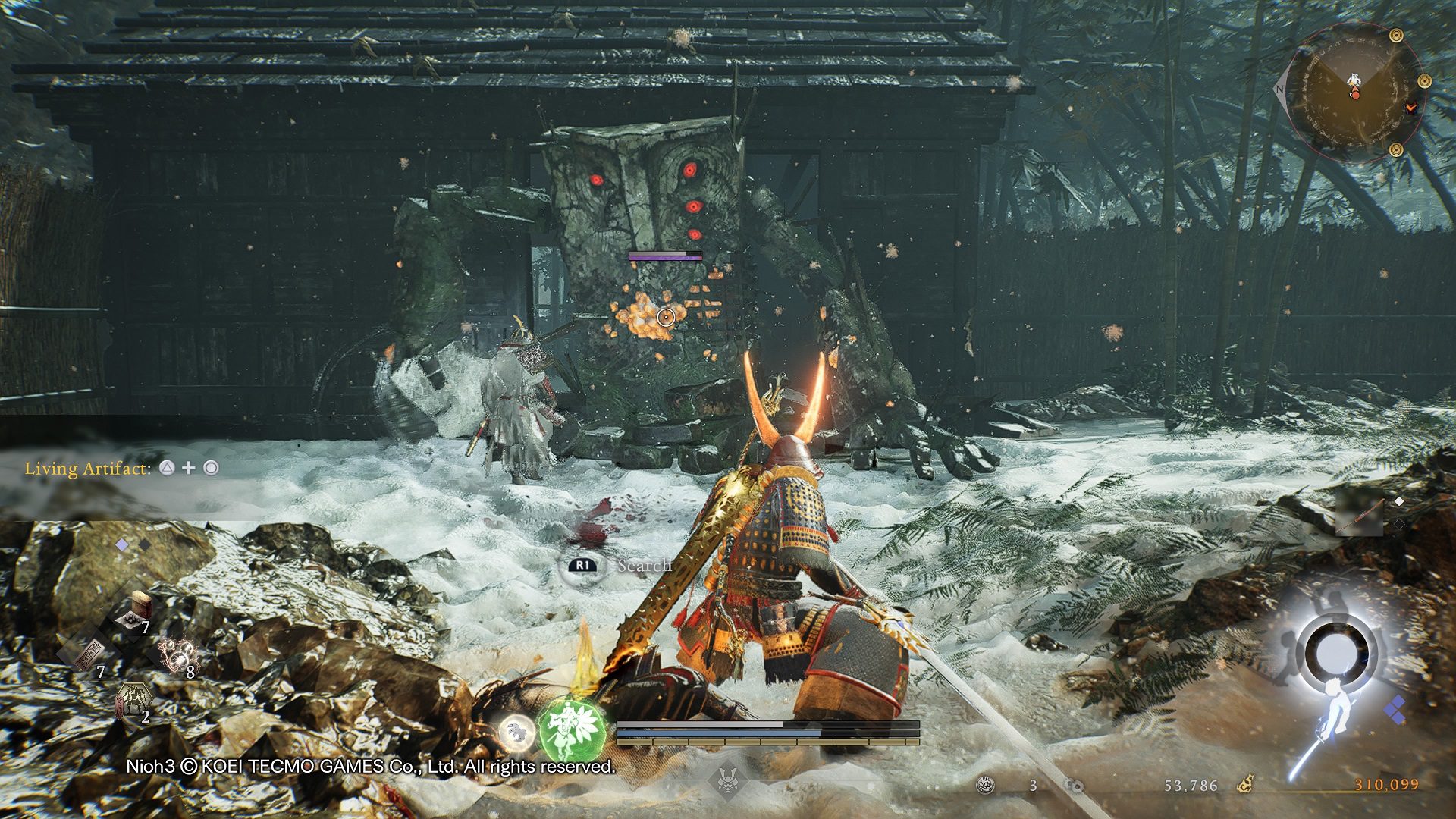 هنگامی که به گرافیک Nioh 3 فکر میکنم، ترکیب همزمانی از گریه و خنده به سراغم میآید. نمیتوان از گرافیک فنی این اثر تعریف کرد. حتی آثاری در کنسول نسل هشتمی PS4 یافت میشود که گرافیک فنی بهتری از Nioh 3 دارند. اما طراحی هنری بازی کمنظیر است. دشمنان، از آنهایی که از Nioh 2 بازگشتهاند گرفته تا شیاطین جدید، همه از زبان طراحی زیبای بازی پیروی میکنند. بیشترین تاثیر گرافیک هنری را در محیط بازی میتوان دید. جهان Nioh در نسخه سوم، متنوعتر و عمیقتر از دو نسخه قبل شده و از جنگلهای سرسبز گرفته تا معابد گوناگون و حتی زمینهای پوشیده شده از برف و یخ را در بر میگیرد. این طراحی هنری کمنظیر، عنصر مهم در ارتقا سری Nioh به جایگاه فعلی داشته و در Nioh 3 نیز قویتر از گذشته عمل میکند. این بخش، پابهپای گیمپلی اعتیادآور بازی حرکت میکند تا این اثر را به یکی از بهترین بازیهای عرضه شده در نسل نهم تبدیل کند. البته Nioh 3 بینقص نیست. بسیاری از بازیهای سولزلایک مشغول کشتی گرفتن با دوربین هستند. Nioh 3 این نبرد را در سنگینوزن ادامه داده.