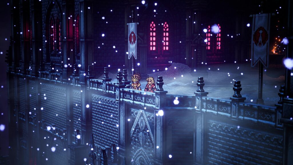 اگر بخواهیم بگوییم که بازی Octopath Traveler 0 در یک بخش بیچونوچرا میدرخشد، طراحی بصری آن است. سبک HD‑2D در این نسخه به اوج پختگی خود رسیده و ترکیب کاراکترهای پیکسلی با نورپردازی مدرن و عمق میدان سینمایی، تصاویری خلق میکند که هم نوستالژیک هستند و هم کاملاً معاصر. تنوع محیطها قابلتوجه است؛ از شهرهای ویرانشده گرفته تا دشتهای وسیع و معابد باستانی. هر منطقه هویت بصری خاص خود را دارد و همین موضوع، اکتشاف را به تجربهای لذتبخشتر تبدیل میکند. موسیقی هم یکی از بخشهای فراموش نشدنی این مجموعه است. موسیقی متن بازی ترکیبی از قطعات جدید و تمهایی است که یادآور نسخههای قبلیاند. هرچند برخی قطعات حس تکرار را القا میکنند، اما در مجموع موسیقی بهخوبی با فضای احساسی بازی هماهنگ است و در لحظات کلیدی، تأثیرگذاری روایت را دوچندان میکند. صداگذاری شخصیتها کیفیت مناسبی دارد، هرچند نبود صداگذاری کامل برای تمام دیالوگها ممکن است برای برخی مخاطبان ناامید کننده باشد. با این حال، اجراهای صوتی موجود بهخوبی حس و حال شخصیتها را منتقل میکنند.