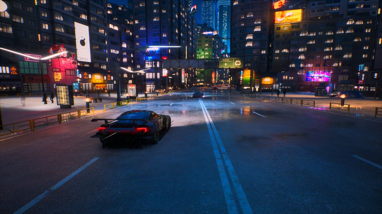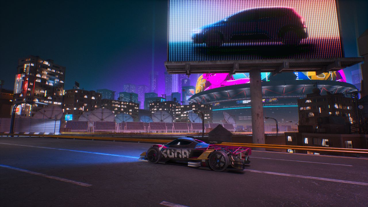 در بخش جلوههای بصری و فنی، شرایط کاملا متفاوت است و اسکریمر یک کلاس درس در زمینه بهینهسازی به حساب میآید. این عنوان با استفاده از موتور گرافیکی Unreal Engine 5 توسعه یافته است و خوشبختانه سازندگان به خوبی از پس مهار این موتور برآمدهاند. شهر آیندهنگرانه و سایبرپانکی Neo Rey با نورپردازیهای نئونی خیرهکننده، انعکاس زیبای نور روی آسفالت و طراحی هنری فوقالعادهاش، دقیقا همان اتمسفری را تداعی میکند که طرفداران زیباییشناسی دهه ۹۰ میلادی به دنبال آن هستند. حس سرعت در بازی بینظیر است و حتی در شلوغترین لحظات مسابقه که انواع و اقسام افکتهای بصری، انفجارها و برخوردها صفحه را پر میکنند، فریمریت بازی روی کنسولهای نسل نهمی کاملا ثابت و بدون افت باقی میماند.